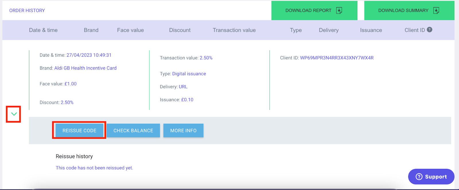 Start by looking up the code in the Tillo Hub on the order history page. Once you are looking at the transaction, click the green arrow to the left of the result. This will bring down additional options for the code including “Reissue Code.”