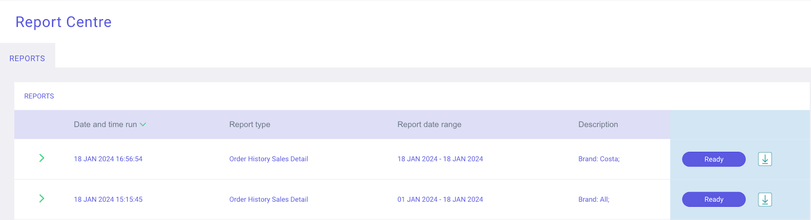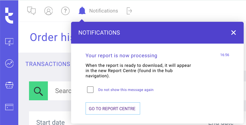 When you press either button to generate a report, you will be prompted to navigate to the Report Centre by clicking the ‘Go to report centre’ button in the notification, or by selecting the ‘Report Centre’ menu item.