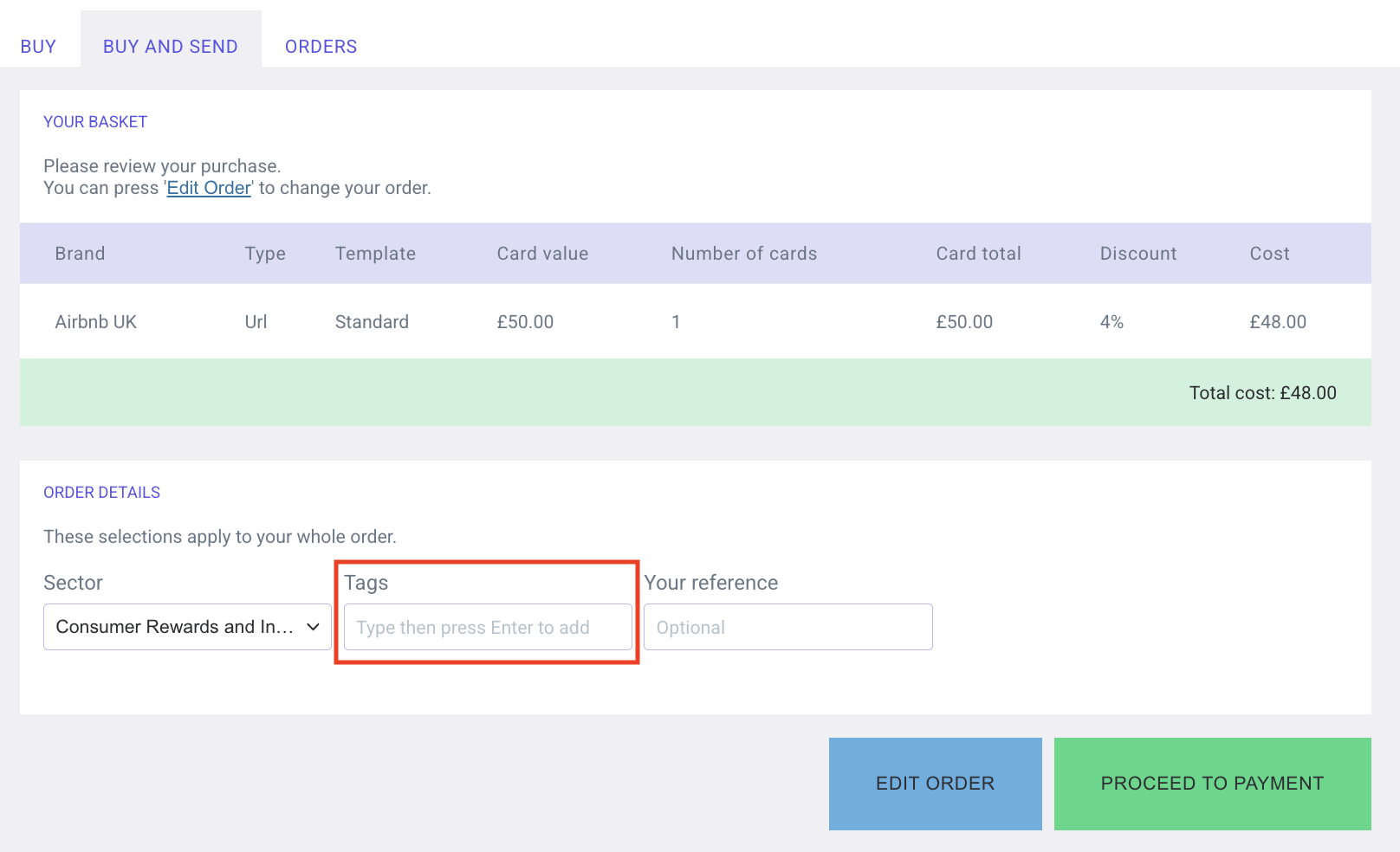 When placing a Bulk Buy order in the Hub, you can add tags manually during the checkout flow. These tags will be applied to every single gift card within that specific order.
