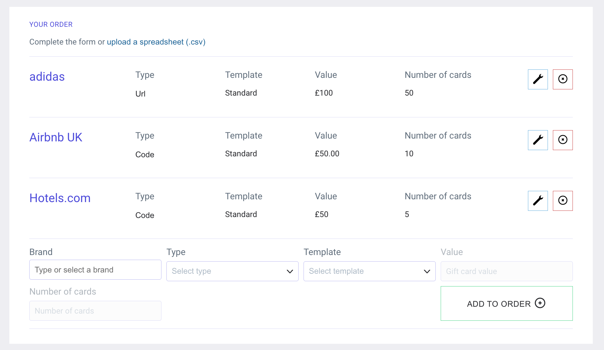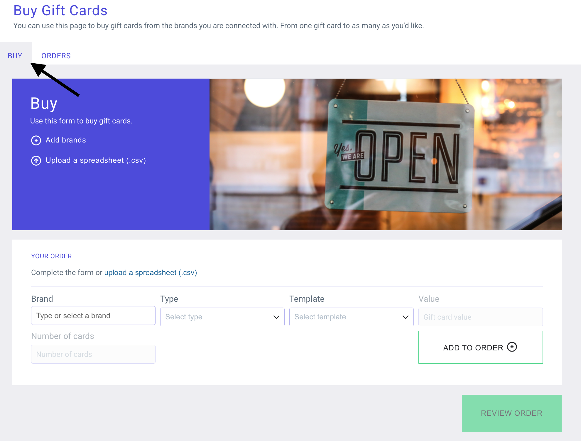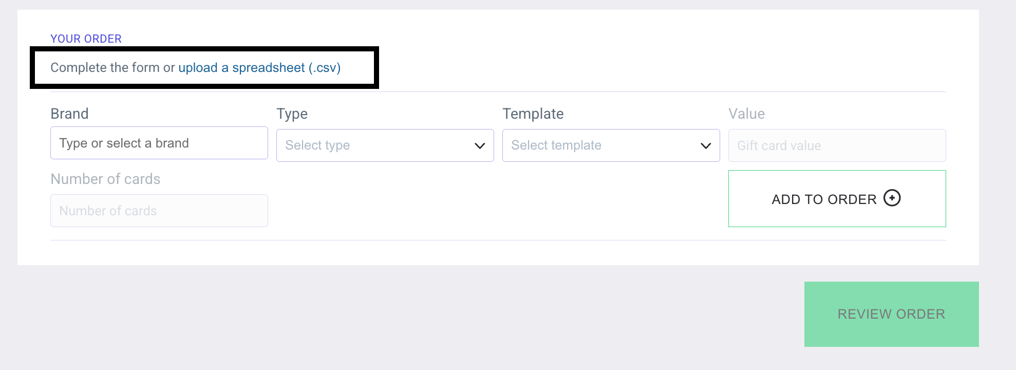 How do I place a manual order for gift cards?