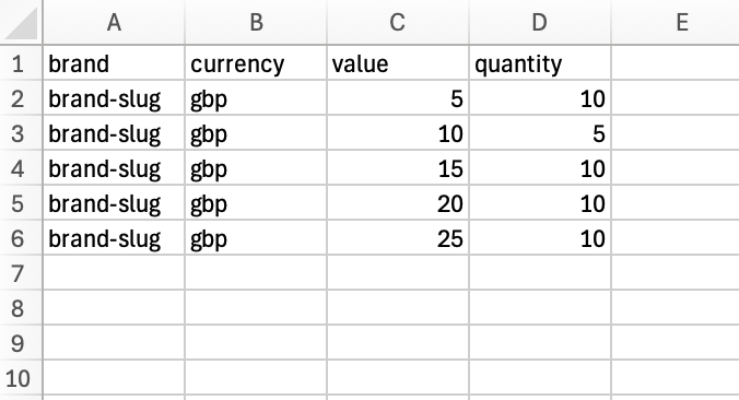 You simply need the brand slug (not just brand name - this can be found in the hub under brand information), currency, value, and quantity.